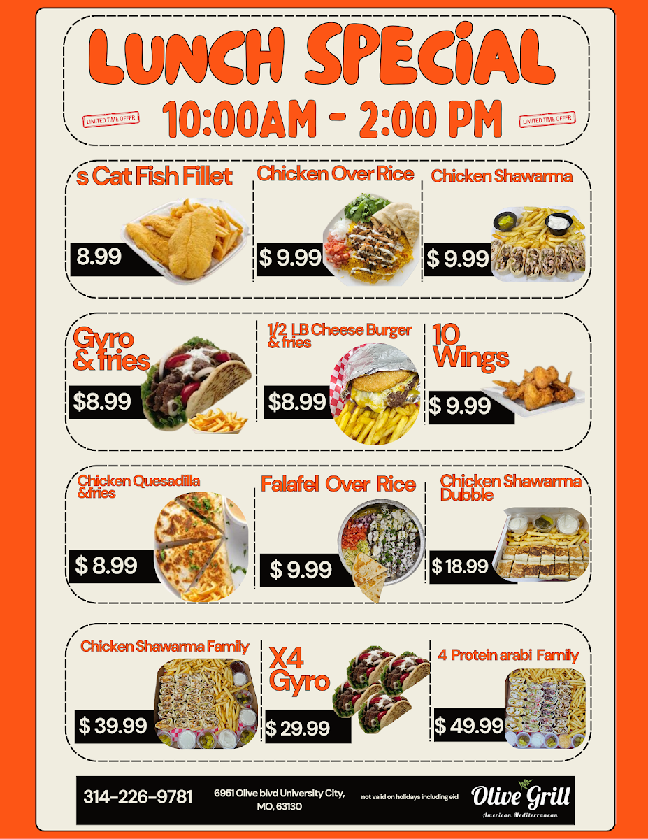 2 sandwiches cut into 14 pcs Lamb Shawarma thinly sliced,tahini sauce, parsley, onions, sumac, middle eastern pickles slices for crunch Chicken Shawarma, garlic sauce, middle eastern pickles Wrapped into tortilla bread then flat panini pressed and Cut into 14 pcs served with garlic sauce &tahini sauce , fries and mixed pickles. This meal is (DAIRY FREE)